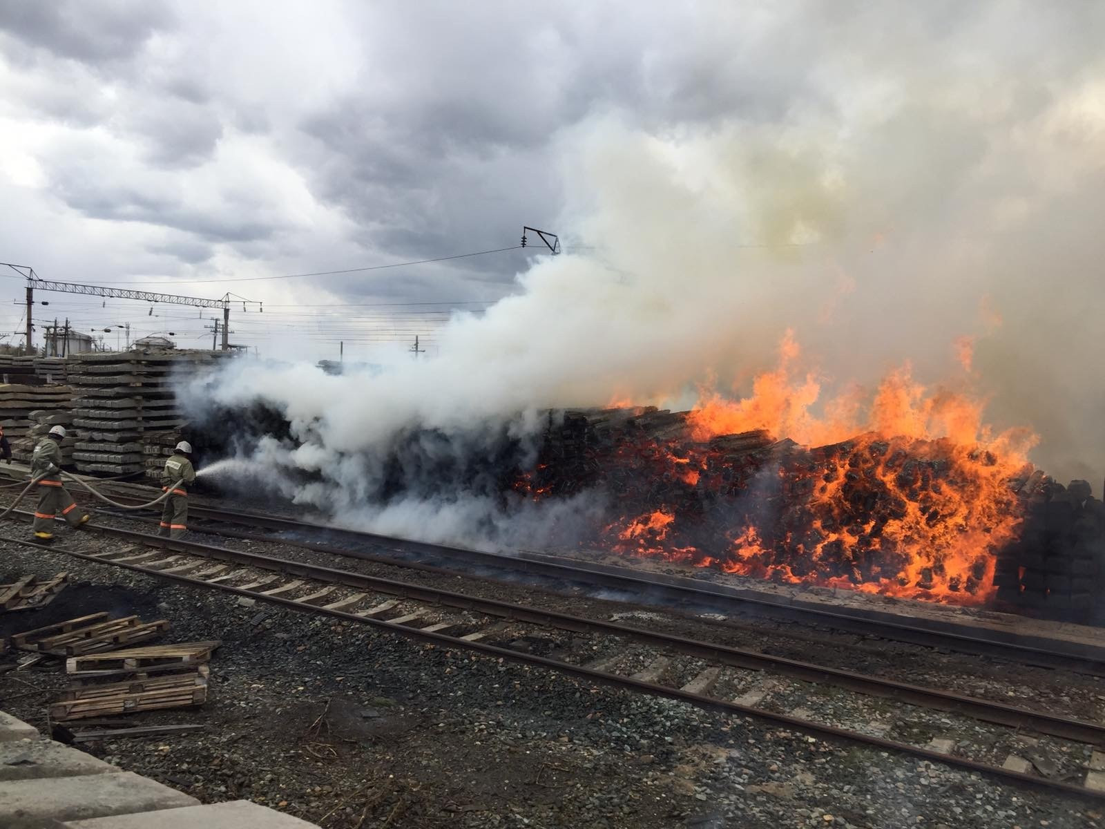 Пожар произошел на территории путевой машинной станции №16. Там загорелись шпалы, которые складировали на открытом воздухе.