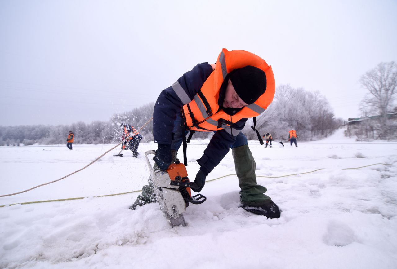 В течение дня планируется провести распил льда на расстоянии 200 метров от старого моста и 100 метров от действующего моста. В ледяном покрове делаются пропилы квадратами на расстоянии около 10 метров от берега. Сквозной пропил позволяет ослабить лёд, он ломается и небольшими фрагментами равномерно, без заторов проходит вниз по течению.
