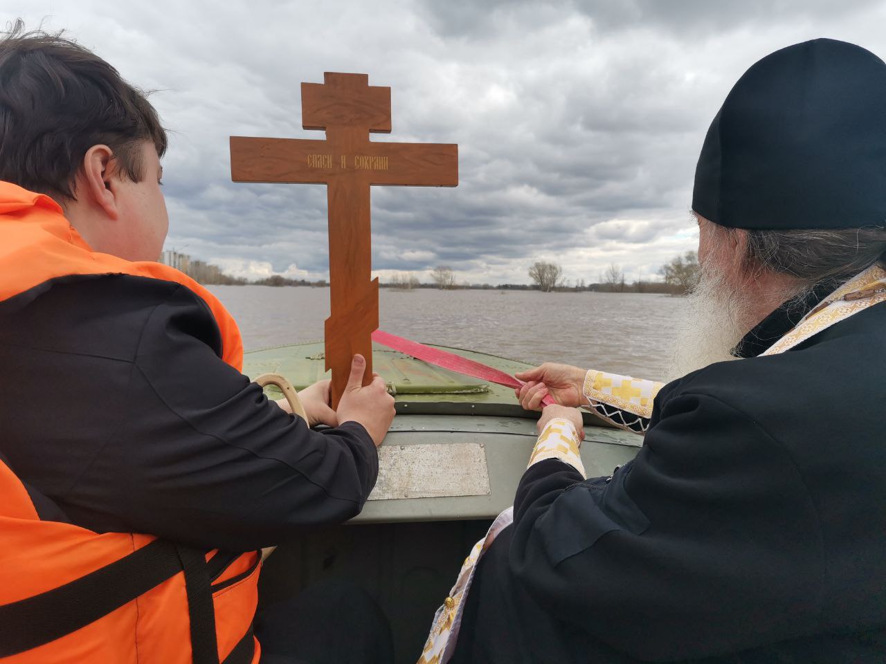 Непосредственно на воде владыка совершил молебен о прекращении наводнения. Вместе с архиереем молились секретарь епархии иерей Вадим Татусь и диакон Никита Нефёдов.