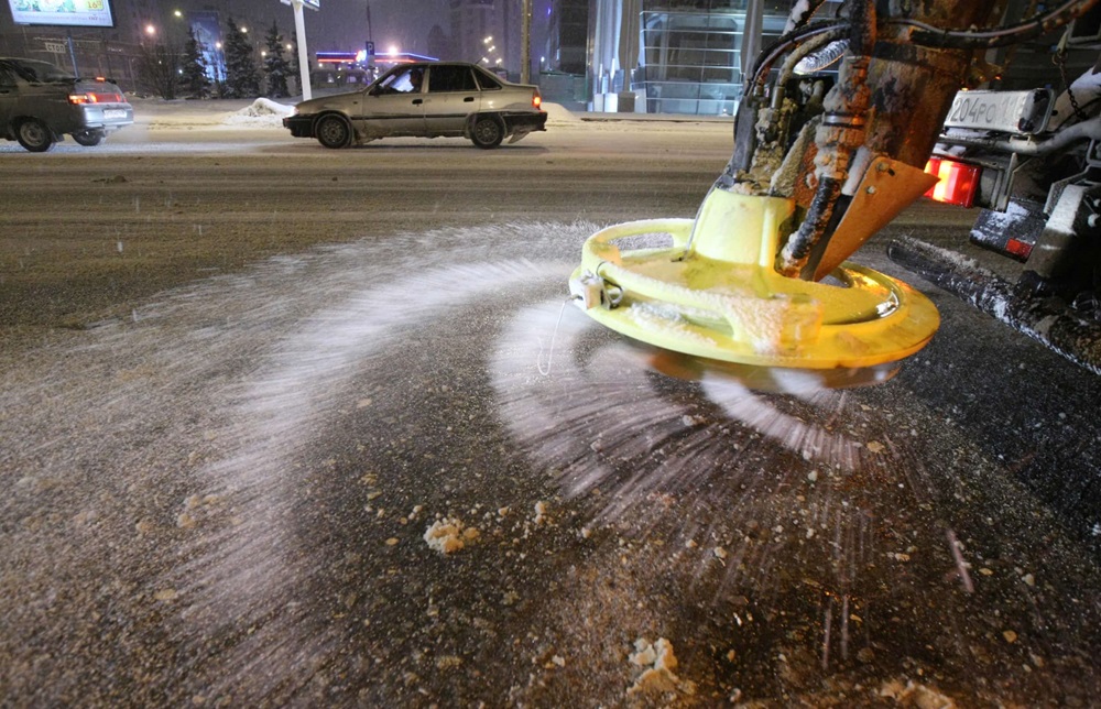 Не дожидаясь образования гололёда, около 10 единиц техники уже просыпают солью мосты, путепроводы, развязки и перекрёстки города.