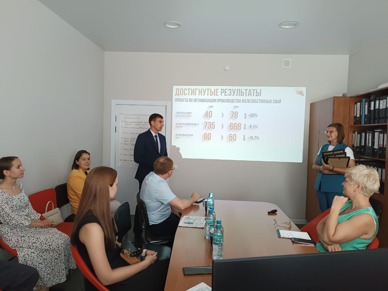 В цехе убрали стеновую перегородку и неиспользуемую ёмкость для воды объемом в 20 кубических метров, установили удобный стеллаж для хранения арматуры, внедрили производственный анализ, перераспределили объём работы между сотрудниками, разработали стандарты рабочих мест и безопасности. За полгода выработка на участке фасовки увеличилась на 70%, время рабочего процесса сократилось на 7,5%, а запасов свай в потоке стало на 16,7% меньше. Реальный экономический эффект от реализации проекта составил 12,8 млн рублей в год.