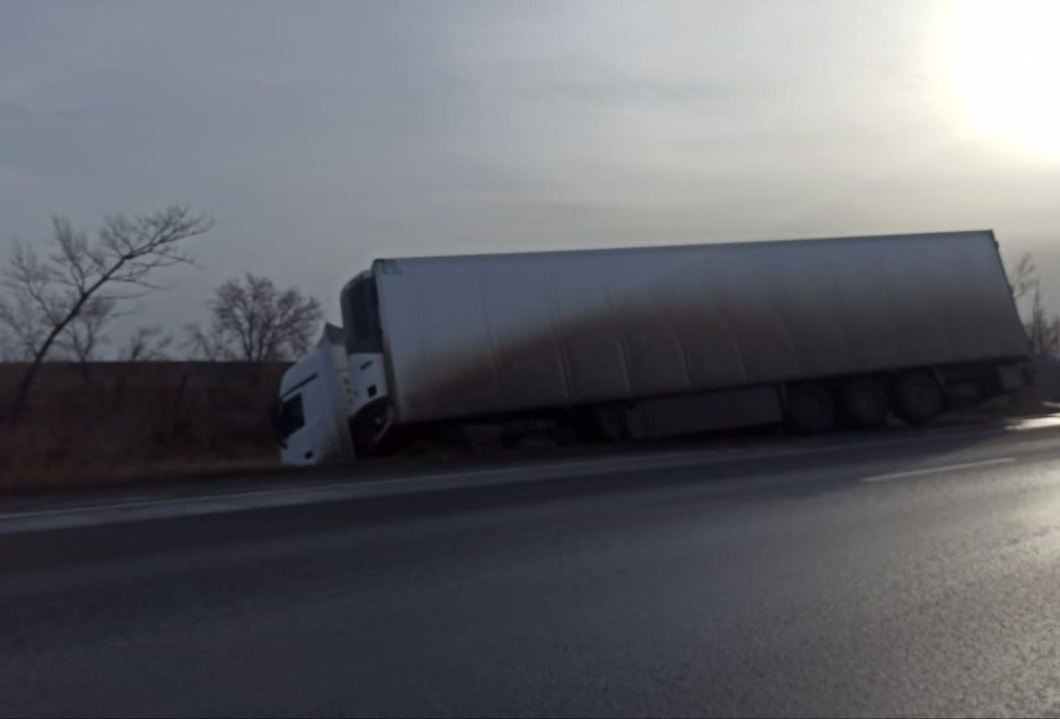 20 ноября около 23 часов на трассе «Соль-Илецк – Оренбург» рядом с селом Дружба фура с полуприцепом слетела в кювет и опрокинулась набок.