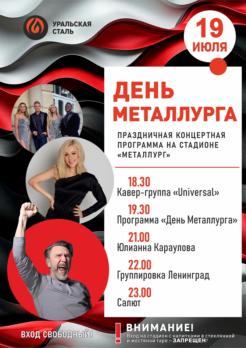 «Уральская Сталь» привыкла баловать горожан и гостей Новотроицка яркими шумными праздниками. Этот год не станет исключением — кульминационным событием дня станет поздравление металлургов руководителями региона, города и компании на главном стадионе города. Для новотройчан и гостей здесь выступят: кавер-группа «Universal», Юлианна Караулова и Группировка Ленинград.