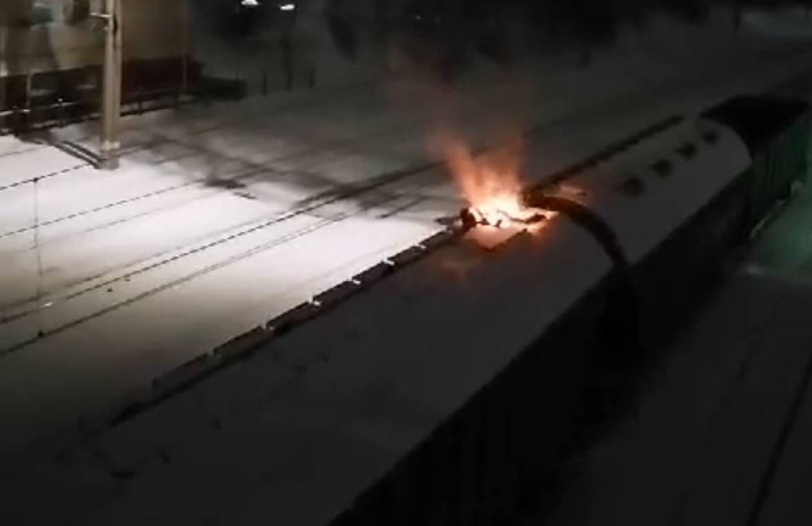 Молодой человек случайно дотронулся до контактного провода и получил удар током. В результате на нём загорелась одежда.