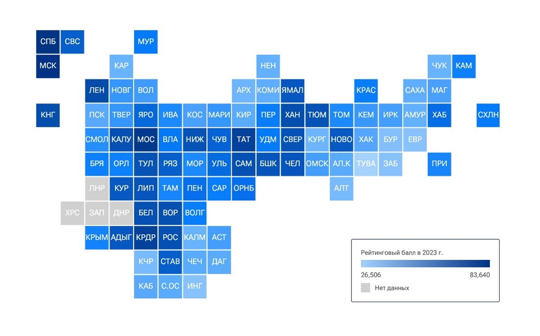 Годом ранее регион также занимал 33-е место. При этом рейтинговый балл увеличился с 52,864 в 2022 году до 55,906 в 2023-м.