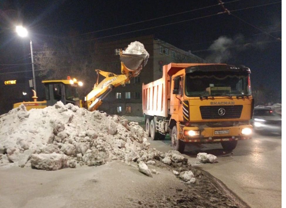 Муниципальные коммунальные предприятия «БиОз» и «Комсервис» в ночь с 24 на 25 февраля на улицах Оренбурга убирали снег.