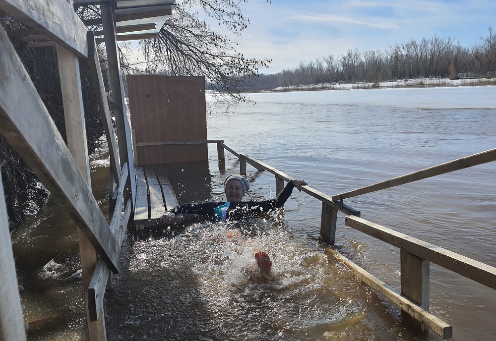 – Я пришла сюда второй раз, в прошлые выходные удалось окунуться возле перил, сегодня деревянный спуск затопило, но я всё равно искупалась на площадке. Ощущение чудесные, такая закалка поднимает жизненный тонус, главное – закаливаться постепенно и соблюдать правила безопасности, – рассказала медработник Елена Шумилина.