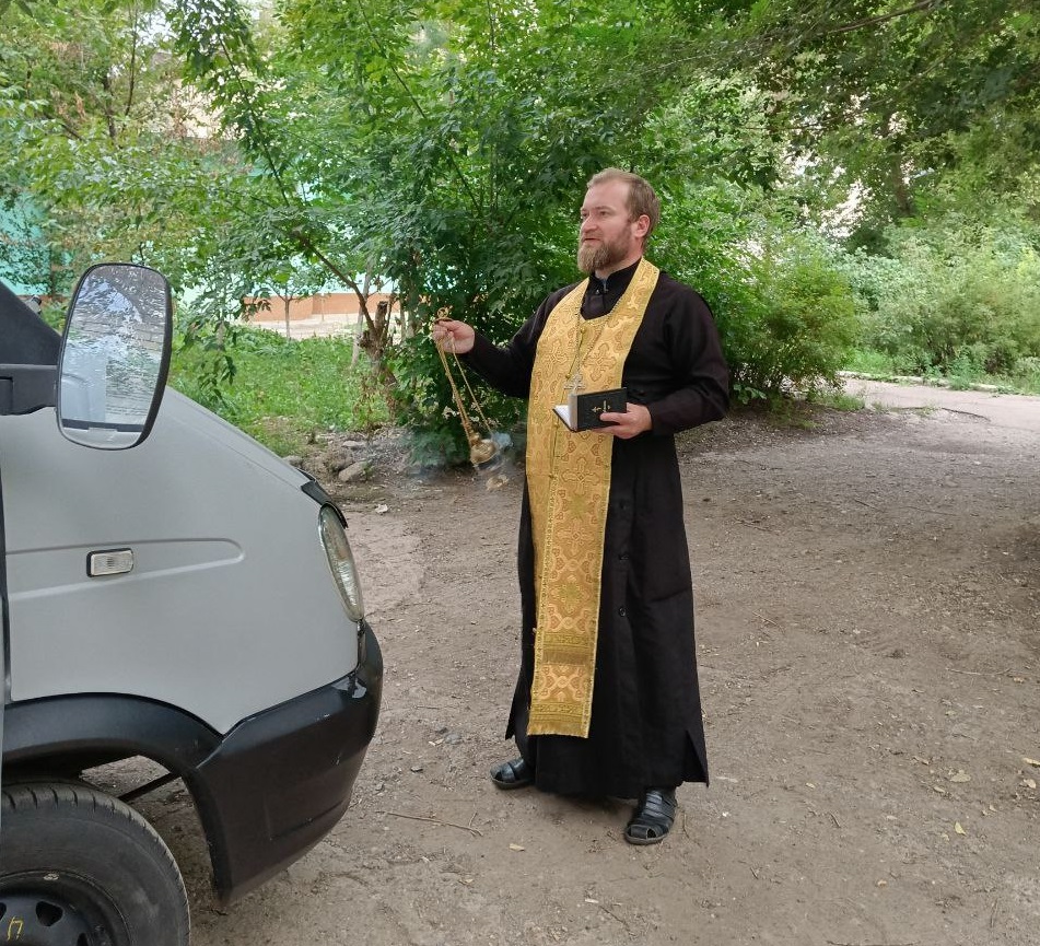 Иерей Димитрий Медведев, координатор службы «Милосердие Оренбург», освятил автомобиль «Соболь», который доставит груз от епархии и оренбуржцев.