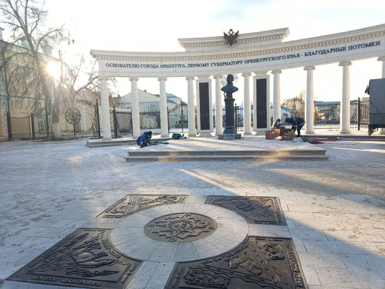 В центральном элементе автор проекта изобразил розу ветров, указал географические координаты Оренбурга и обозначил расстояние до 12 городов, расположенных в разных частях света, в том числе до двух крупнейших городов Евразии – Стамбула и Нью-Дели.