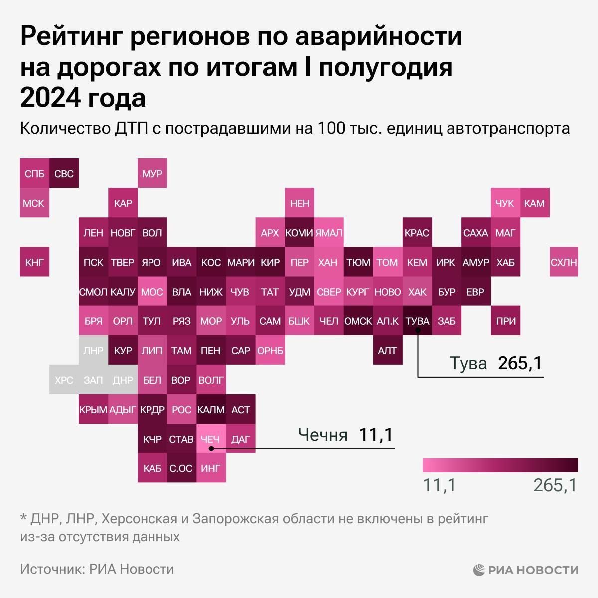 Меньше всего случаев ДТП с пострадавшими в Чечне, ЯНАО и Чукотке. Больше всего – в Туве, Калмыкии и Омской области.