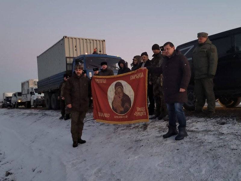 Когда казаки ехали с гуманитарной миссией вслед за добровольцами, директор Самарского филиала «Российской газеты» Арсений Бабенков вручил атаману Первого отдела Оренбургского казачьего войска Сергею Слепову освящённое в Софийском соборе Великого Новгорода знамя.