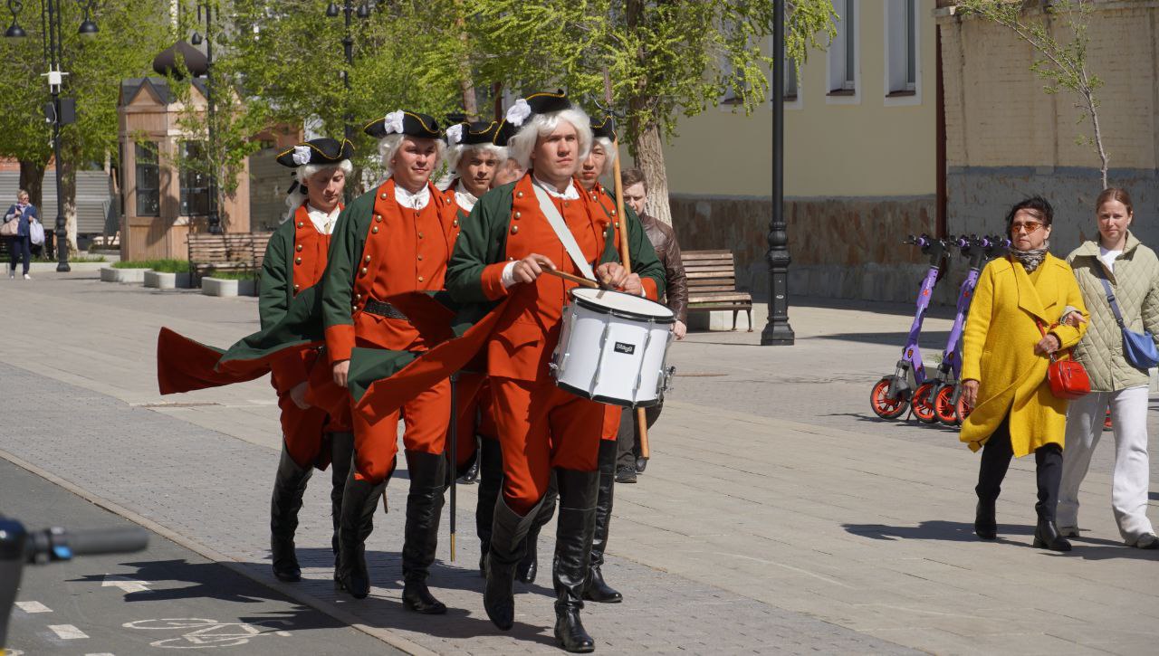 Военнослужащие Оренбургского военного гарнизона со шпагами, украшенными вензелем императрицы Елизаветы, и барабанами парадным маршем прошли по улице Советской — от улицы Правды до Беловки.