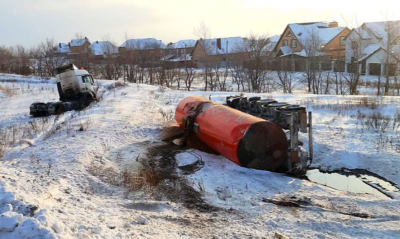 Информация о ДТП поступила в 10.00. Водитель грузового автомобиля MAN не справился с управлением и допустил съезд в кювет по ходу движения. В настоящее время происходит утечка нефтепродуктов из цистерны. Уже вытекло 39 кубометров, площадь загрязнённой территории — 100 квадратных метров.