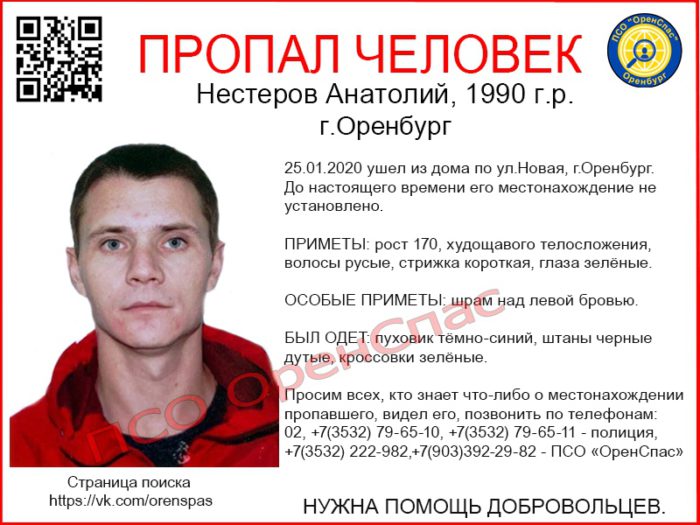 Анатолий Нестеров 1990 года рождения пропал 25 января 2020 года. Он ушёл из дома по улице Новой Оренбурга и до настоящего времени его местонахождение неизвестно.