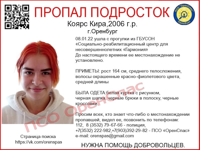 8 января Кира Коярс, воспитанница ГБУСОН «Социально-реабилитационный центр для несовершеннолетних «Гармония» Оренбурга, ушла с прогулки и до настоящего времени её местонахождение неизвестно.