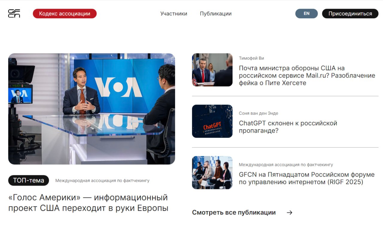 Сайт доступен на английском и русском языках, на его страницах уже опубликованы первые расследования. Сейчас на ресурсе можно узнать о порядке вступления в Международную ассоциацию, а также ознакомиться с Кодексом ответственного фактчекинга и опровержениями, подготовленными экспертами GFCN.