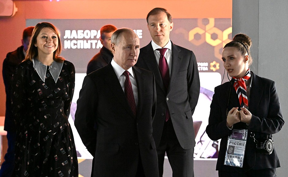 Президент ознакомился с экспозицией Министерства промышленности и торговли «Сделано нами». В 10 тематических залах собраны сотни инсталляций, рассказывающие о вызовах, с которыми сталкивались российские предприятия и изобретатели, о современных достижениях промышленности в регионах.