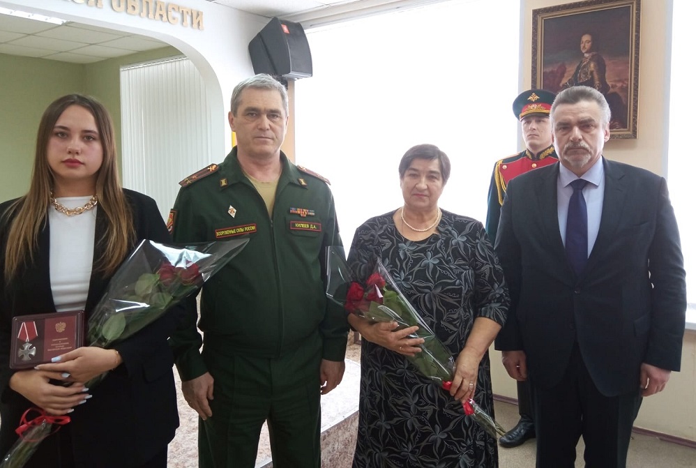 Вице-губернатор Дмитрий Кулагин и военный комиссар области Дмитрий Килеев вручили награду матери погибшего Лидии Григорьевне и его младшей дочери Татьяне.