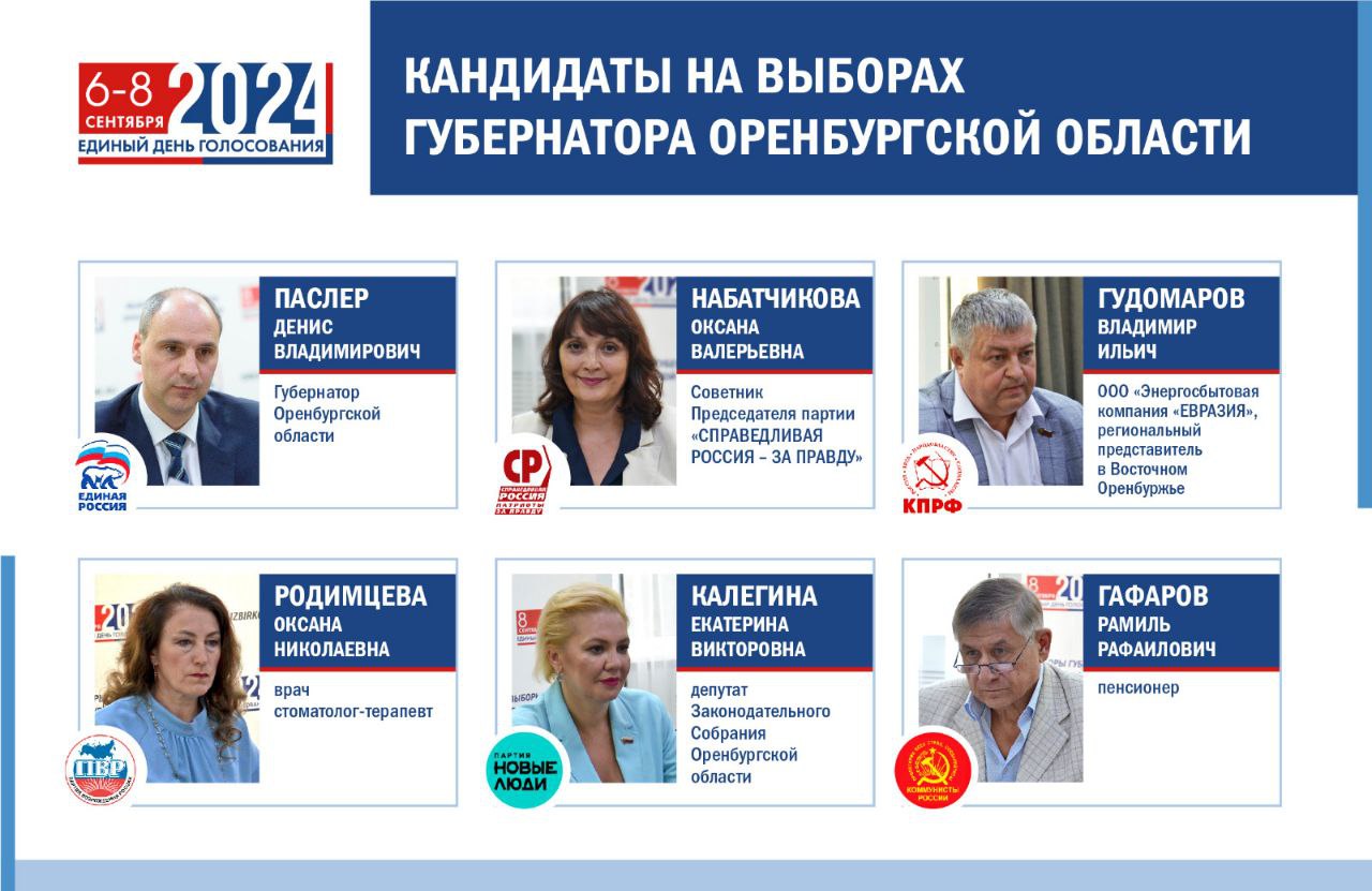 Первым документы в областной Избирком подал действующий губернатор Оренбуржья Денис Паслер от «Единой России». Затем это сделали советник руководителя фракции в Госдуме РФ Оксана Набатчикова от «Справедливой России – За правду», председатель орского местного отделения Владимир Гудомаров от КПРФ, врач стоматологической клиники города Оренбурга Оксана Родимцева от Партии возрождения России и депутат Законодательного собрания области Екатерина Калегина, выдвинутая политической партией «Новые люди». Шестым претендентом на пост губернатора Оренбургской области стал пенсионер Рамиль Гафаров, выдвинутый избирательным объединением «Политическая партия «Коммунистическая партия коммунисты России».