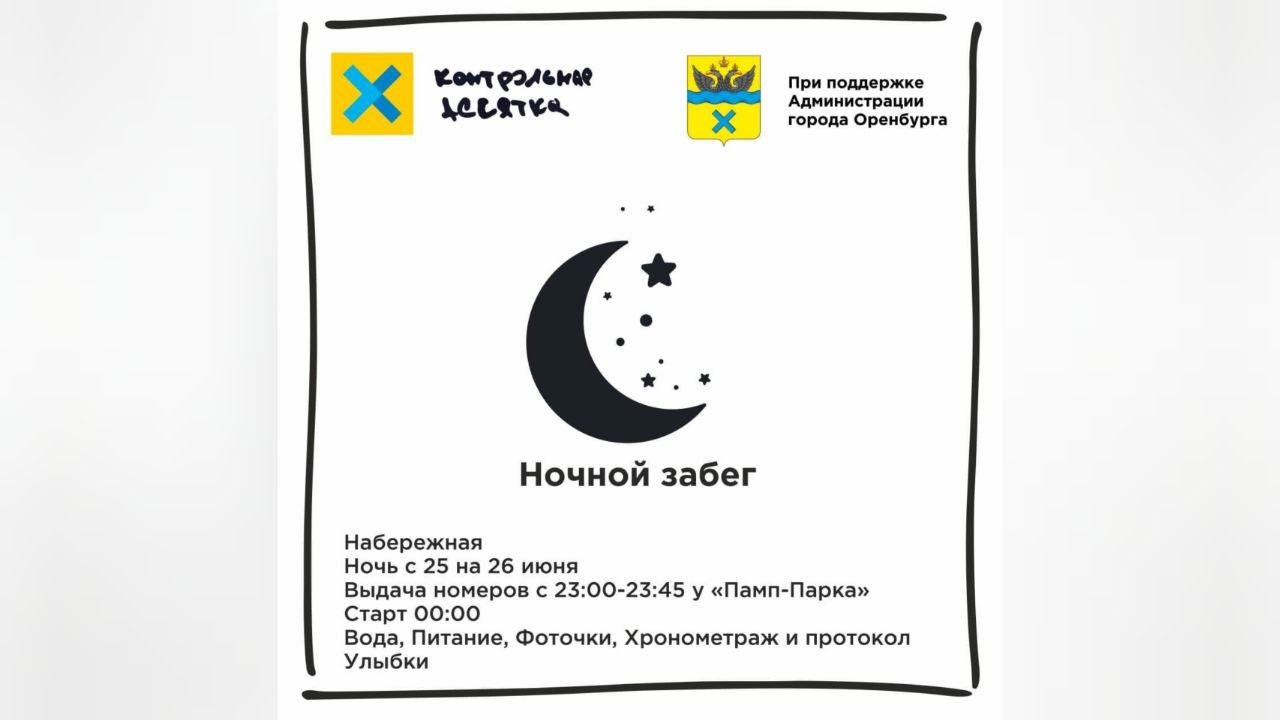 Областное беговое сообщество совместно с городским спорткомитетом ко Дню молодежи 25 июня на набережной Урала организовали ночной забег «Контрольная десятка». Название забега указывает на длину дистанции — 10 километров.