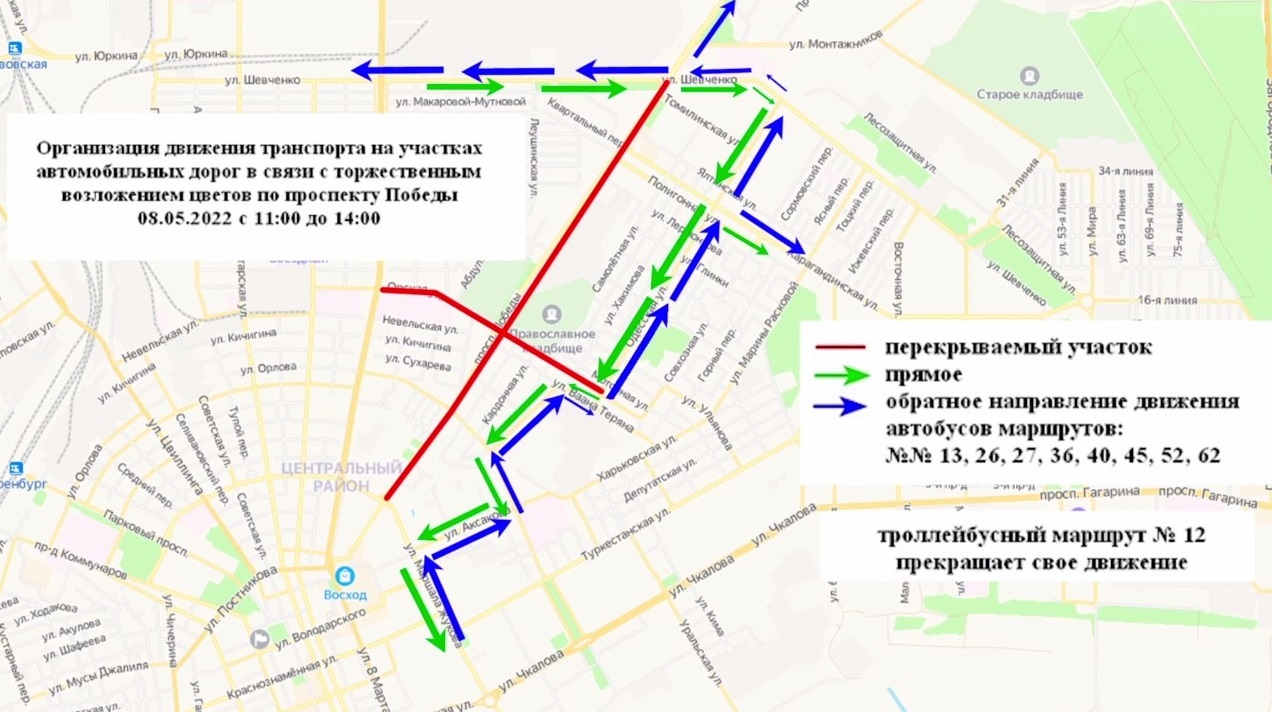 В частности, будет перекрыт проспект Победы от улицы Шевченко до улицы Рыбаковской, улица Орская — от улицы Терешковой до улицы Одесской, улица Кирова — от улицы Бурзянцева до улицы Чичерина, улица Новая — от улицы Терешковой до улицы Пролетарской).