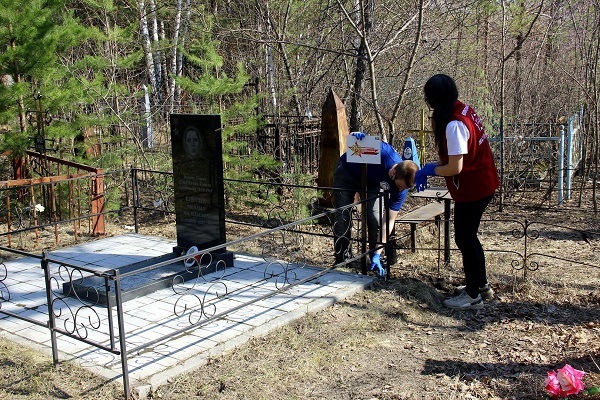 Семиклассники из школы № 5 имени Алексея Лавкова убрались возле захоронения Н.В. Мамаевой. Кадеты из школы № 3 имени Героя Советского Союза Ивана Акимова привели в порядок братские могилы умерших от ран в годы войны в эвакогоспитале