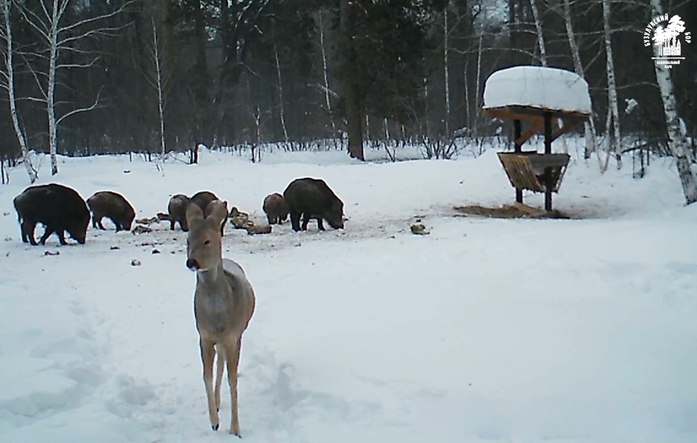 Сотрудники нацпарка поделились документальным подтверждением этого. На видеозаписи видно, как трапезу делят косули и кабаны. Причём умудряются соблюдать очередность подходов.