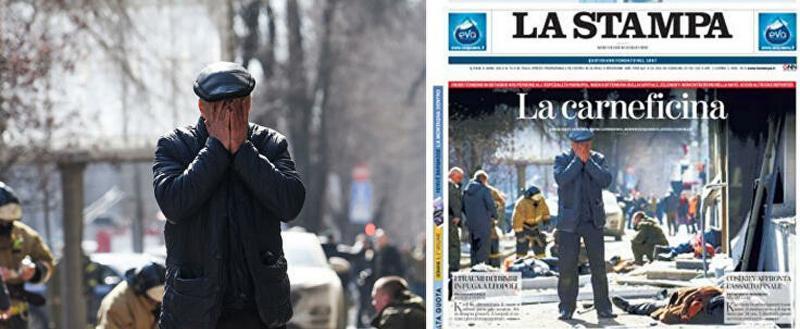 Напомним, утром 14 марта в центре Донецка прогремел взрыв от украинской ракеты. Погиб 21 человек, 35 – оказались в больнице. Фотокорреспондент URA.RU оказался рядом и снял последствия трагедии. На фото изображен мужчина, закрывающий руками лицо, на фоне погибших и разрушенной улицы. Именно этот снимок итальянское СМИ опубликовало на первой полосе с заголовком La carneficina («Резня»). Под ним была подпись: «Вот так Киев сталкивается с финальной атакой российских войск».