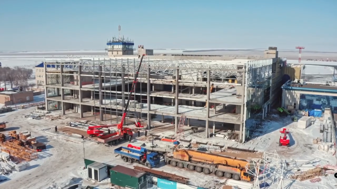 В главной воздушной гавани области продолжается возведение нового пассажирского терминала. Строители выполняют работы по остеклению фасадов и монтажу кровли.