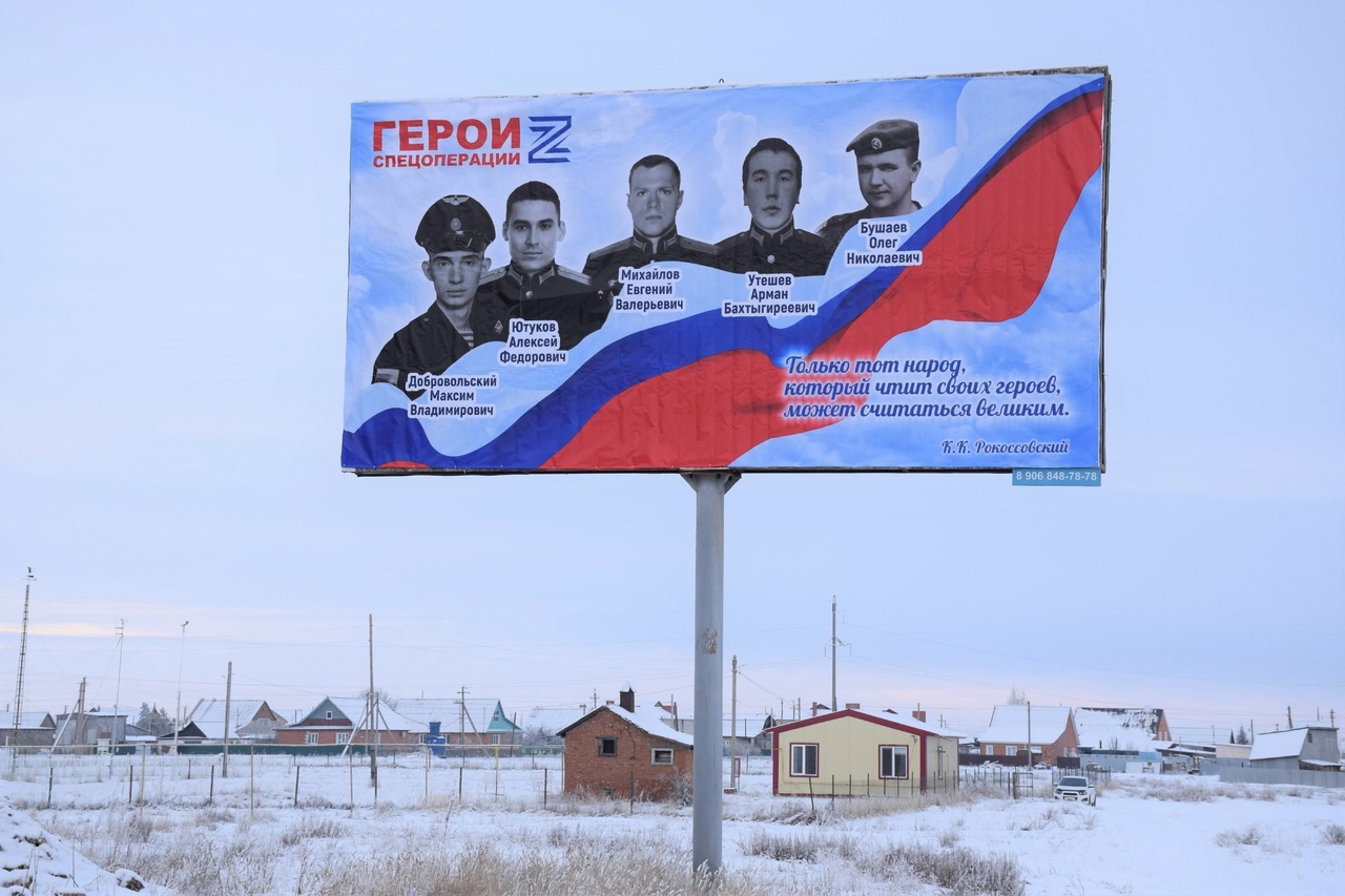 На баннере размещены портреты Олега Бушаева, Максима Добровольского, Евгения Михайлова, Армана Утешева, Алексея Ютукова. Все они выполняли свой воинский долг в зоне специальной военной операции на Украине.