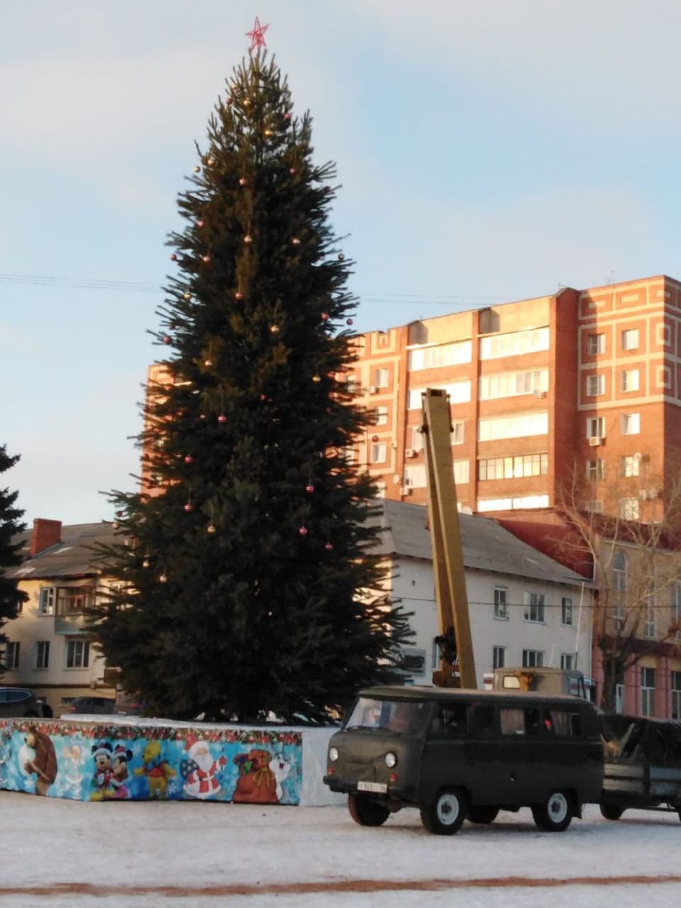 На центральной площади Бугуруслана сотрудники коммунальной службы уже наряжают елку.
