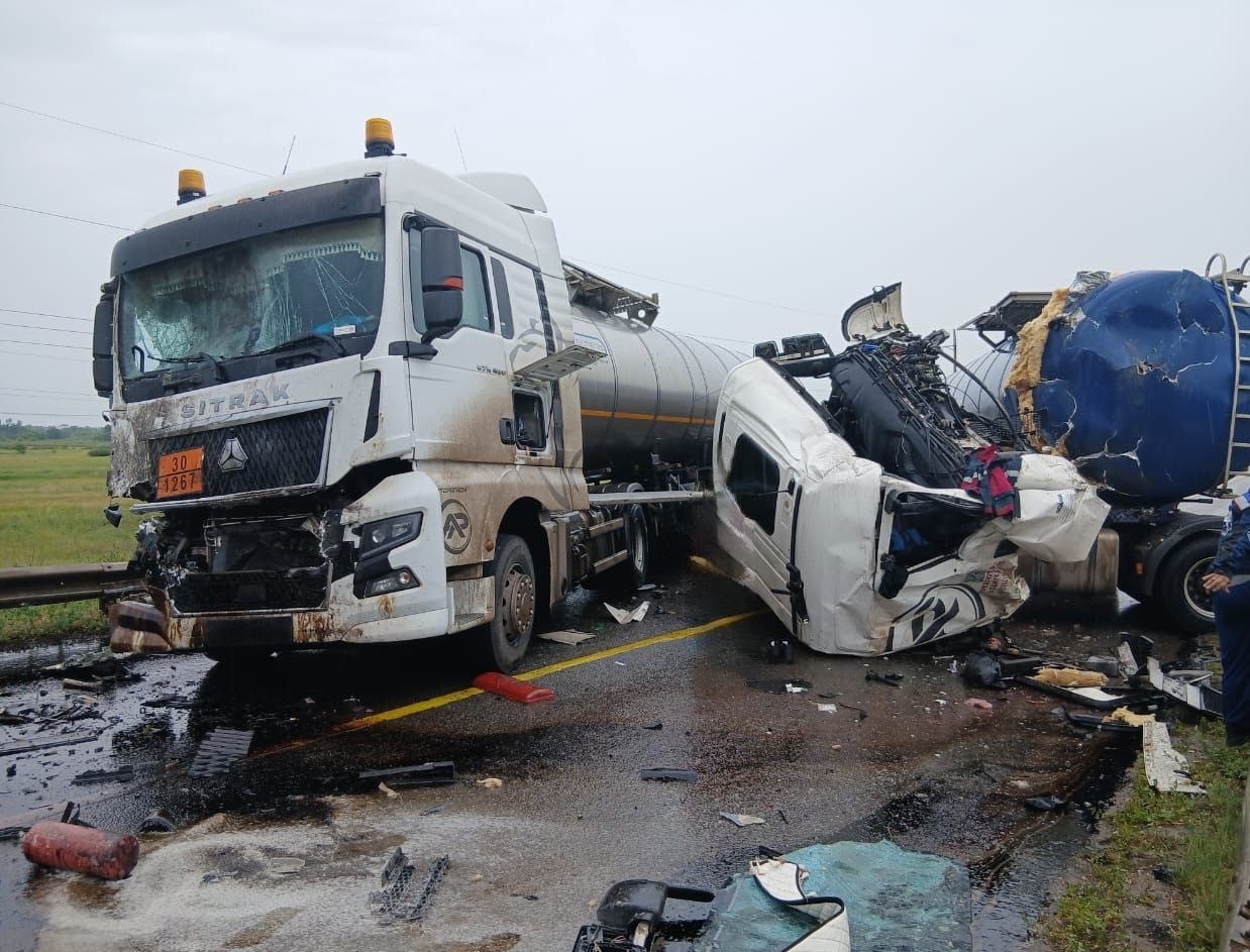 Водитель Scania с полуприцепом-цистерной не выдержал безопасную дистанцию и столкнулся с автомобилем SITRAK также в сцепке с полуприцепом-цистерной, который двигался в попутном направлении и остановился на красный свет. SITRAK отбросило на впереди стоящий КАМАЗ в сцепке с полуприцепом-цистерной. В результате столкновения произошел разлив сырой нефти на проезжей части.