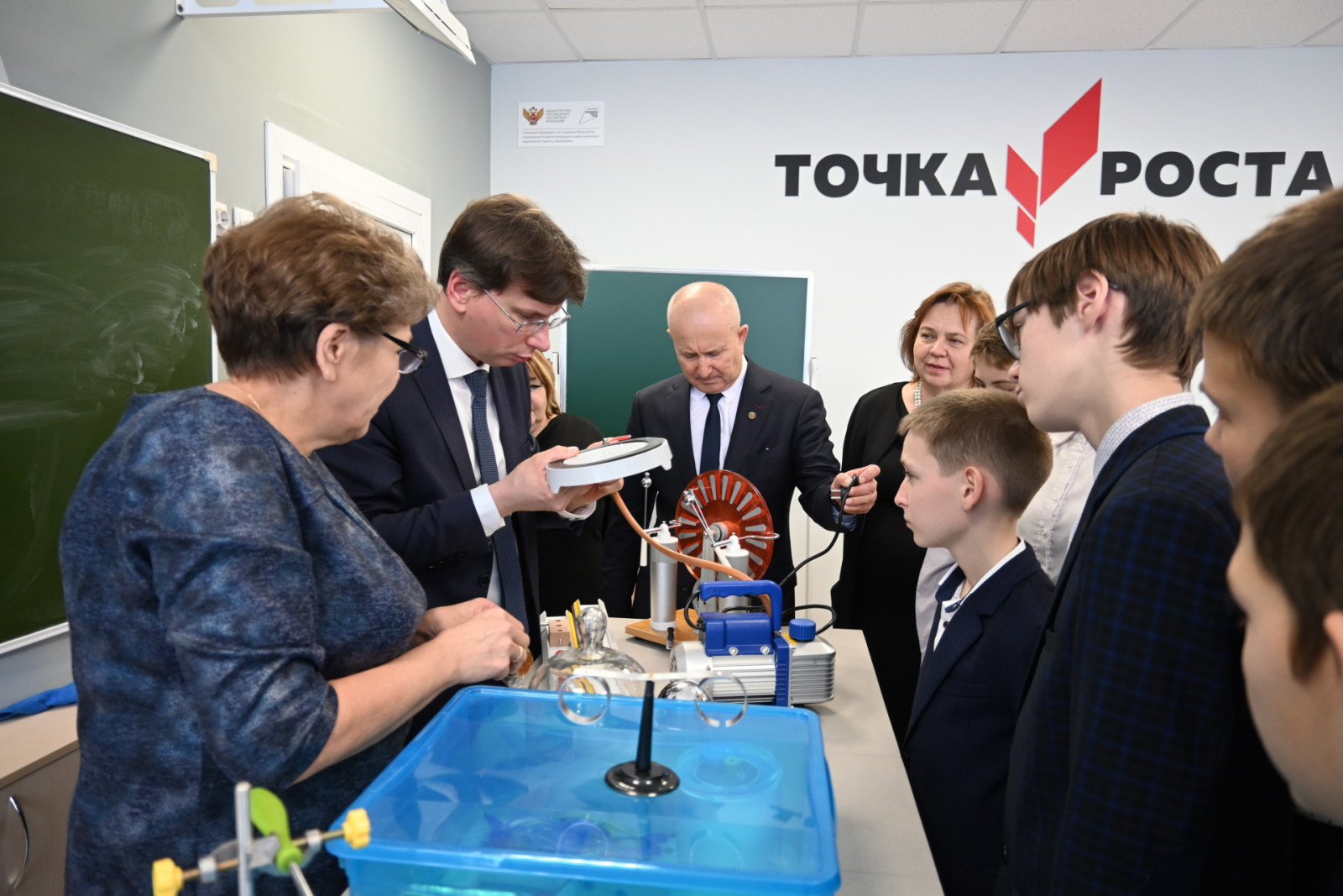 В разговоре о важном со старшеклассниками и уроке физики приняли участие глава района, министр образования и заведующая районным отделом образования.