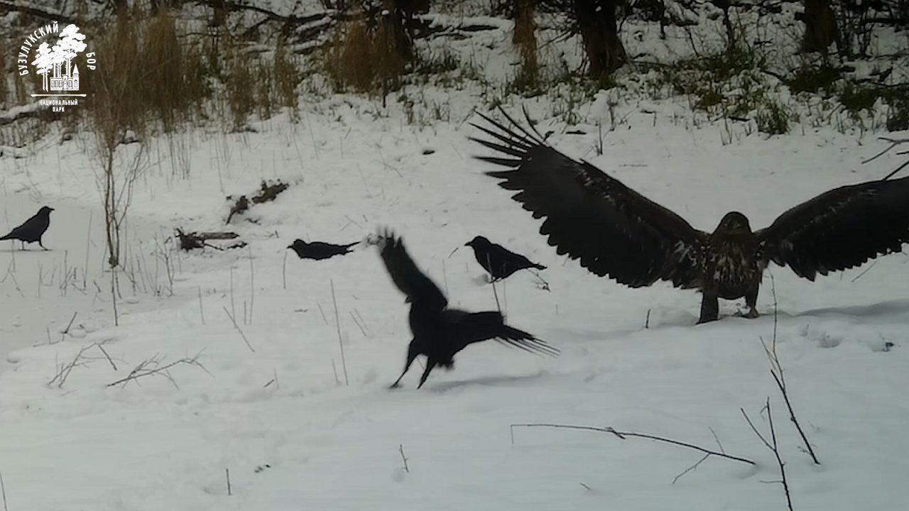Объектив одной из фотоловушек, установленных в «Бузулукском бору», запечатлел трапезу молодого орлана-белохвоста. Крылатый хищник почти мирно соседствовал с воронами.