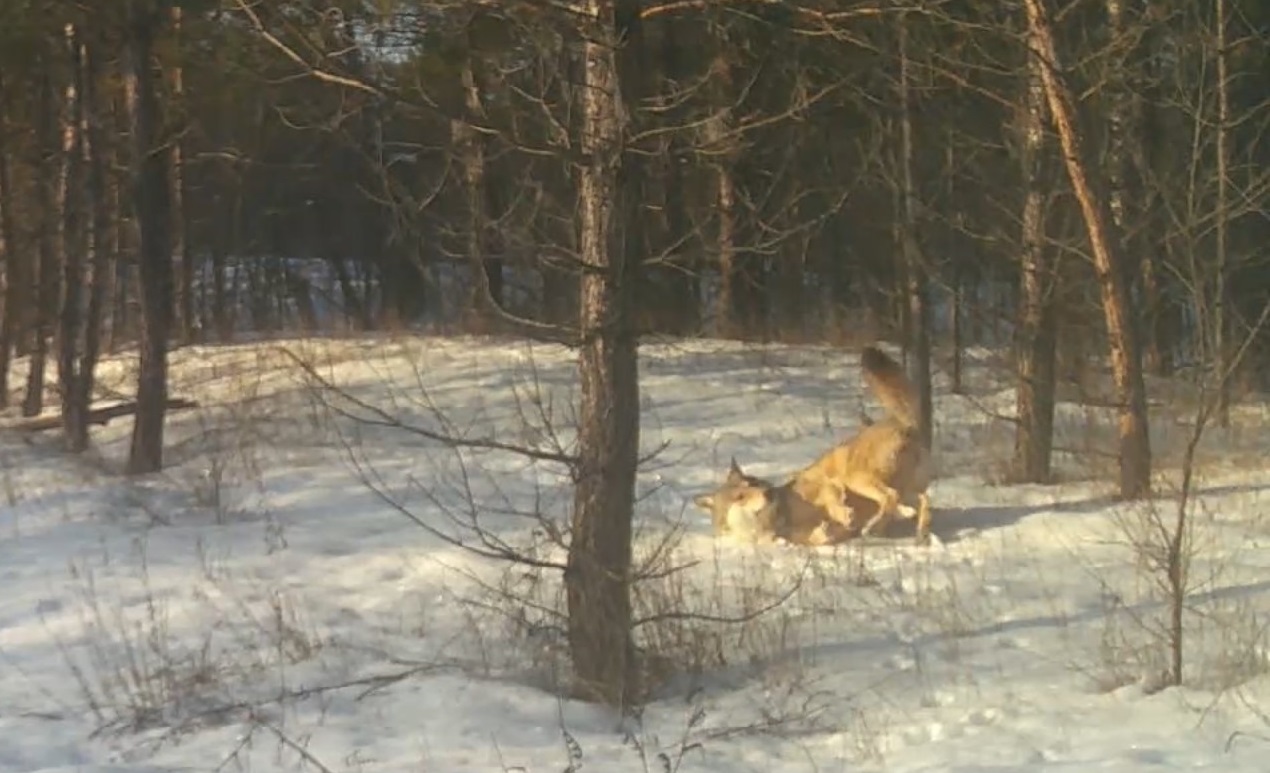 Сотрудники «Бузулукского бора» поделились в официальном Telegram-канале национального парка видеозаписью с волком, принимающим «снежную ванну».