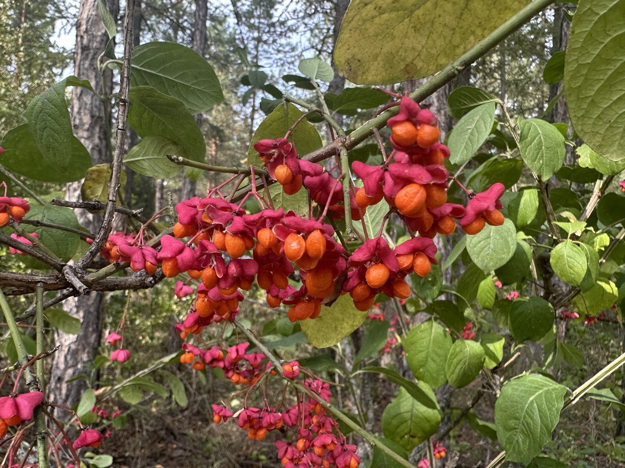 Один из них обычный для Оренбуржья бересклет бородавчатый. Его стебли густо усыпаны чёрно-бурыми пробковыми наростами-бородавочками. Свисающие поодиночке скромные плоды-«серёжки» имеют специфический запах, привлекающий насекомых.