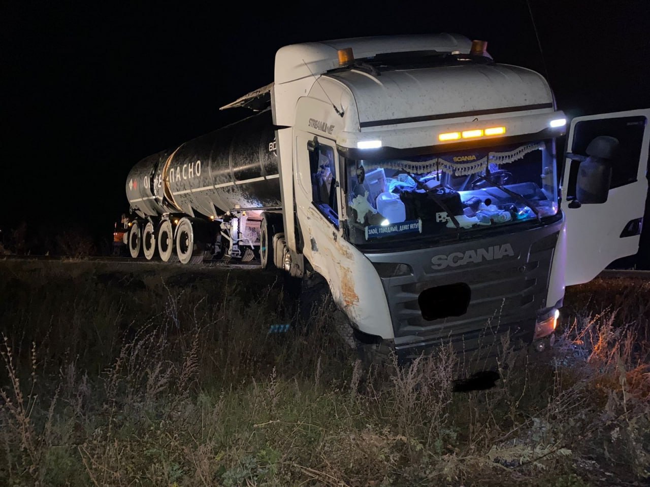 48-летний водитель большегруза SCANIA R440 с полуприцепом-цистерной выехал на встречку и допустил столкновение с грузовиком «КамАЗ» под управлением 59-летнего водителя. После этого «КамАЗ» съехал в кювет. Прибывшие на место пожарно-спасательные подразделения не допустили возгорания и произвели смыв топлива.