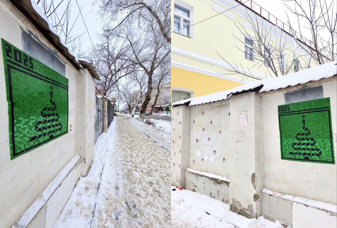 Городской художник «Жёлтый Кубик» поделился новым пиксельным творчеством, изобразив змею в виде новогодней ёлки.