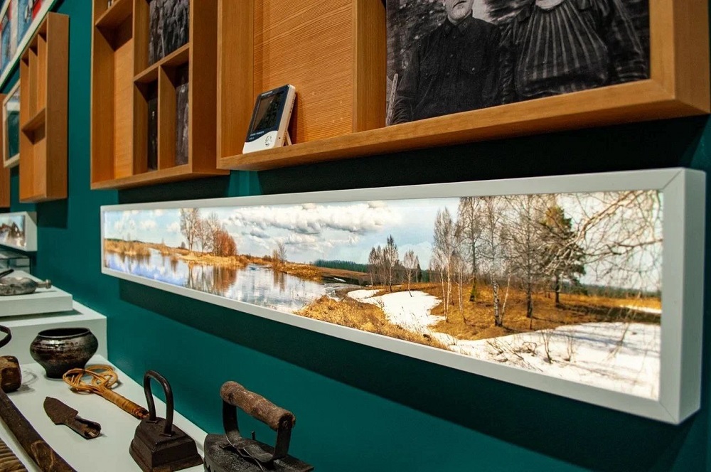 По периметру экспозиция делится на три яруса. Верхний – властно-государственный, здесь «обитают» государи, губернаторы, генеральные секретари, президенты и их указы. Средний ярус – летопись села: череда поколений и событий жизни с рассказами об отдельных людях, складывающихся в единый семейный альбом. Нижний ярус посвящен земле, годовому кругу сезонов и циклу сельскохозяйственных работ.