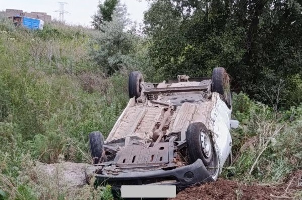 Водитель автомобиля Renault Logan не справился с управлением и допустил съезд в правый кювет, после чего машина опрокинулась.