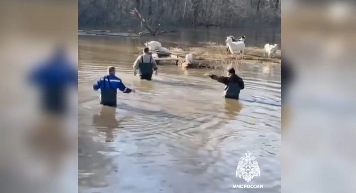 Вблизи села Студёное спасатели на плавающем транспортере вывезли домашний скот: стадо свиней и коз оказалось на отрезанной водой возвышенности. Животные остались без еды и возможности вернуться на сушу.