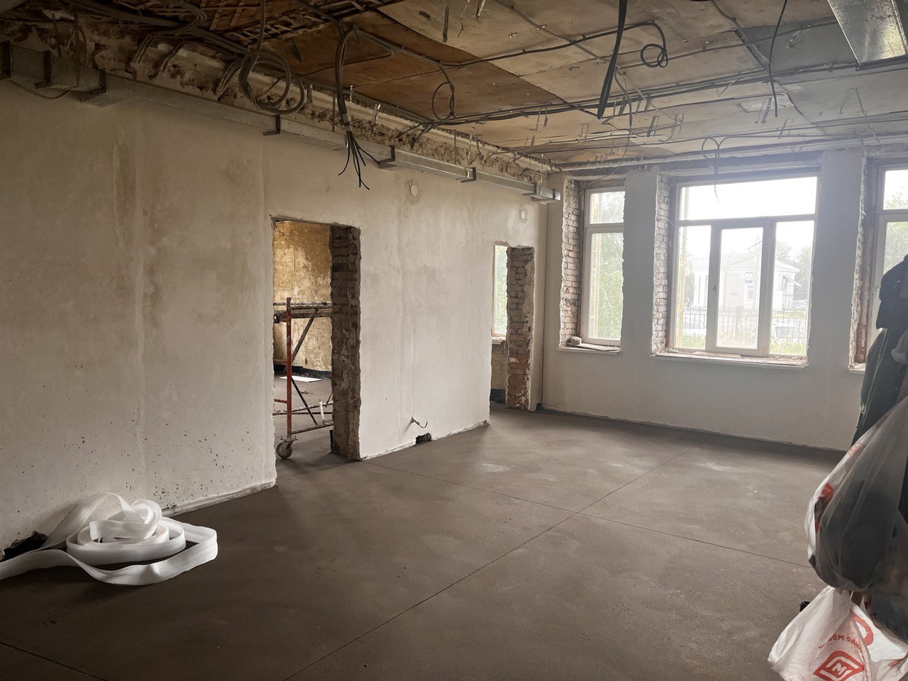 Работы идут с опережением графика. Полностью завершены внутренние демонтажные работы, оштукатуривание в режимных кабинетах и стяжка пола. Полным ходом идет внутренняя чистовая отделка, установка дверей, монтаж электрики. Готовятся поверхности стен под монтаж фасада, закончена обрешётка крыши и начат монтаж профнастила кровли.