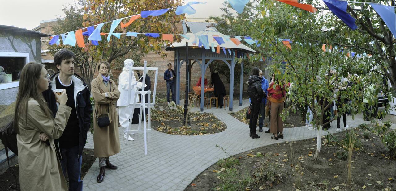 В дворике смонтировали уличное освещение, построили беседку для проведения мастер-классов с детьми, организовали место для выставок, лекций, кинопоказов, озеленили территорию.