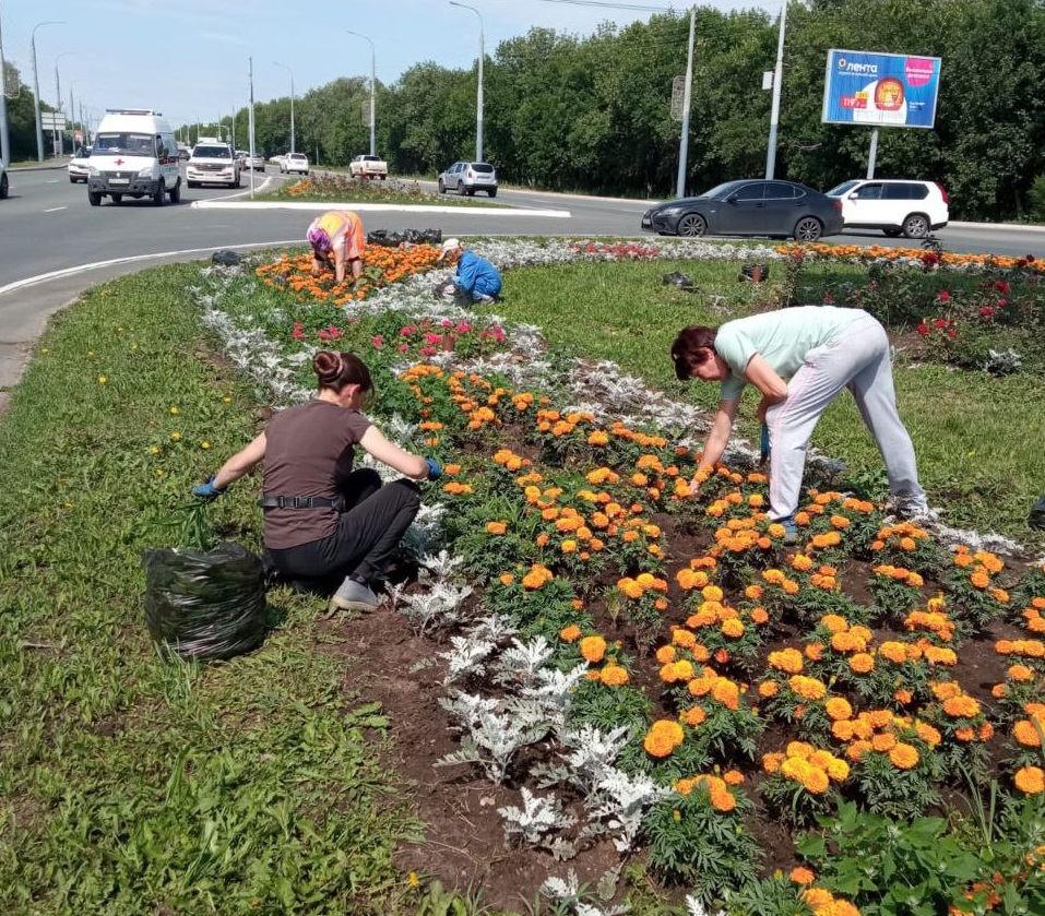 Продолжаются работы по благоустройству в микрорайоне Ростоши – там высаживают цветы и ухаживают за клумбами.