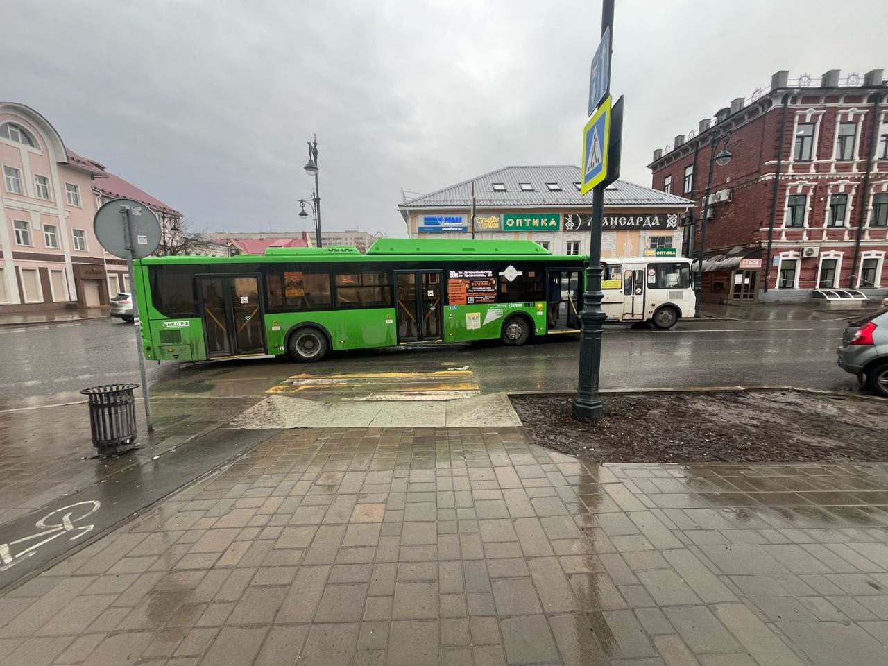68-летний водитель маршрутного автобуса «ЛиАЗ» при повороте направо сбил 31-летнюю женщину, которая переходила дорогу по пешеходному переходу на разрешающий сигнал светофора.
