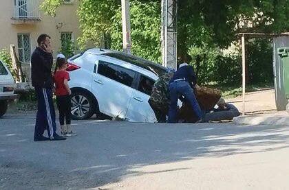 Во дворе дома на 1-м проезде Кривцова автомобиль KIA Sportage провалился в яму возле мусорных баков.