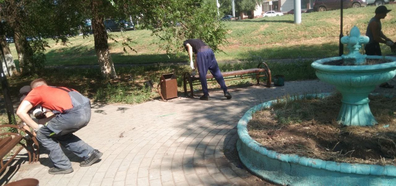 Один из объектов, который сегодня приводят в порядок, — аллея, расположенная по нечетной стороне проспекта Гагарина, в районе остановки «Улица Мира». Рабочие очищают территорию, убирают мусор, красят скамейки и урны.