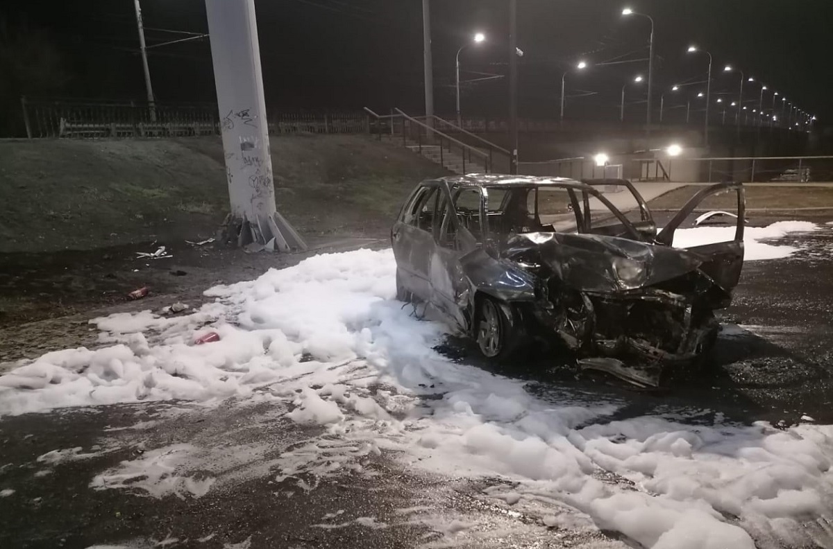 23-летний водитель автомобиля LADA Kalina, в салоне которого находились две 20-летние пассажирки, не справился с управлением. Машина съехала в кювет, врезалась в опору рекламного щита и загорелась. Водитель и одна из пассажирок были госпитализированы. Вторую пострадавшую после оказания медицинской помощи отпустили домой.