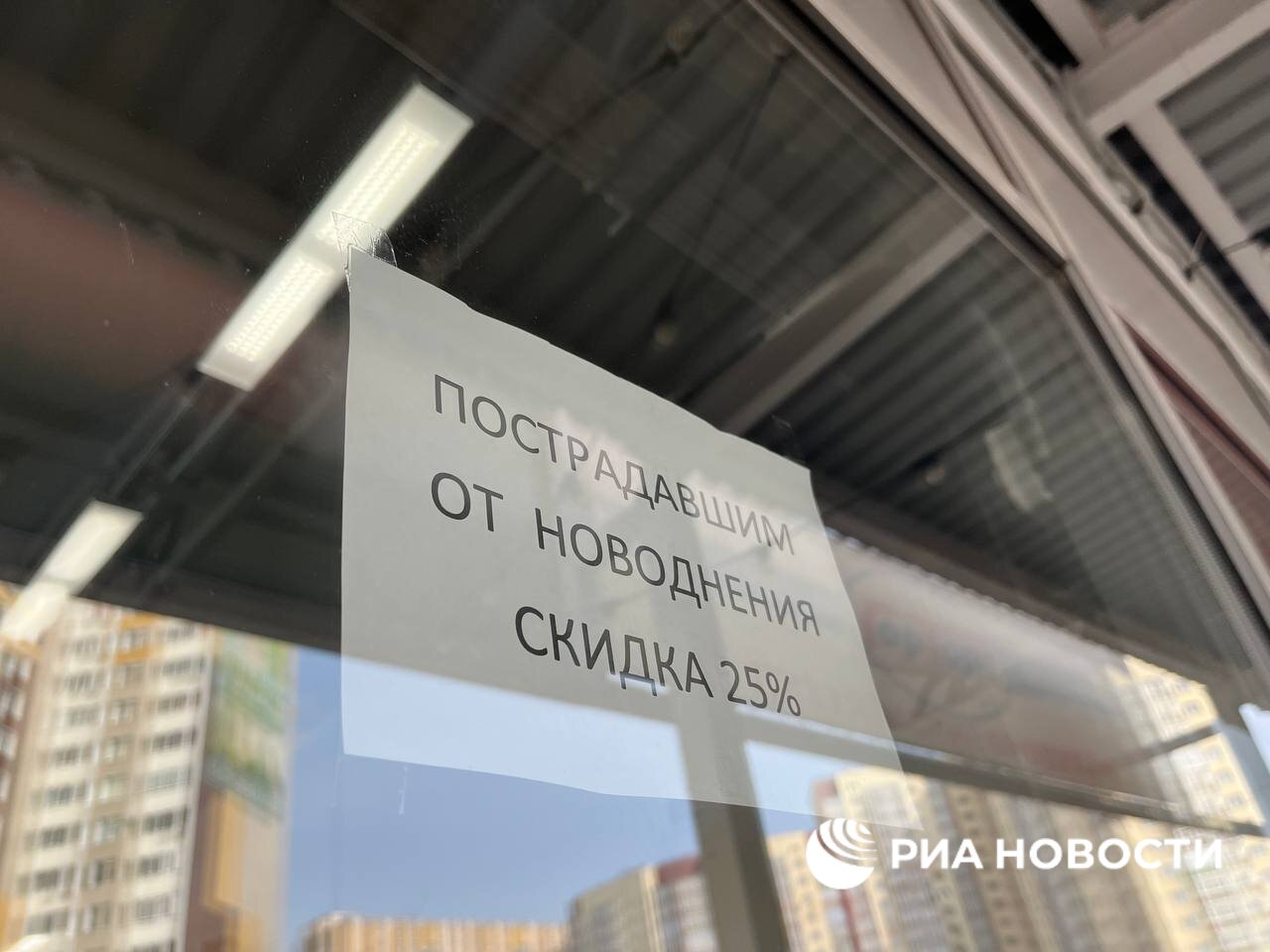 На входе в магазины можно видеть надписи «Пострадавшим от наводнения скидка 25%», «Сегодня скидка 20%», сообщает РИА Новости.
