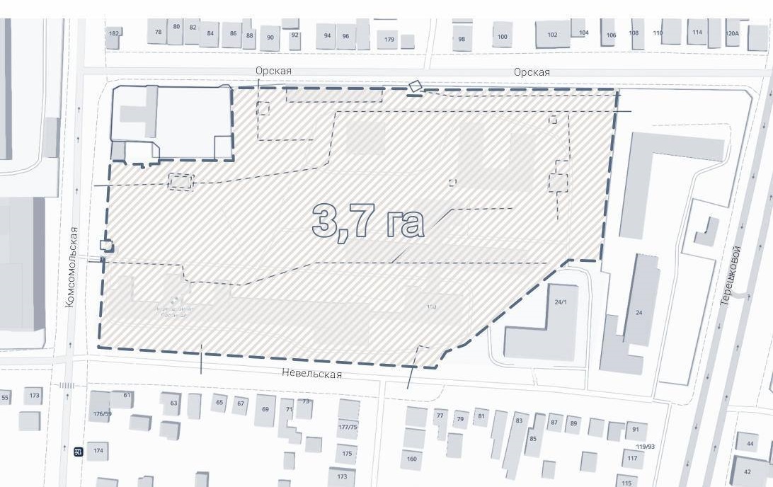Территория для проектирования площадью 3,7 га находится на участке, ограниченном улицами Терешковой, Орской, Невельской и Комсомольской в Оренбурге.